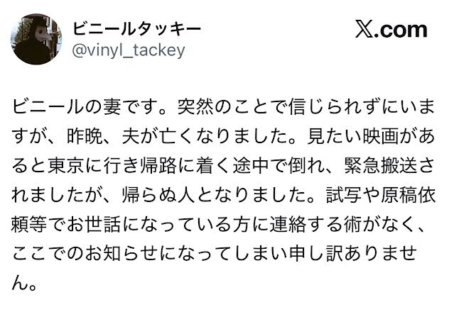 訃報は翌11日、妻が本人のX(旧Twitter)アカウントを通じて公表し、